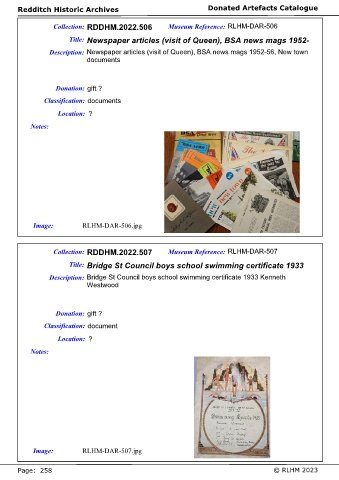 Redditch Historic Archives Donated Artefacts Catalogue