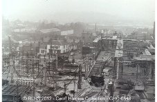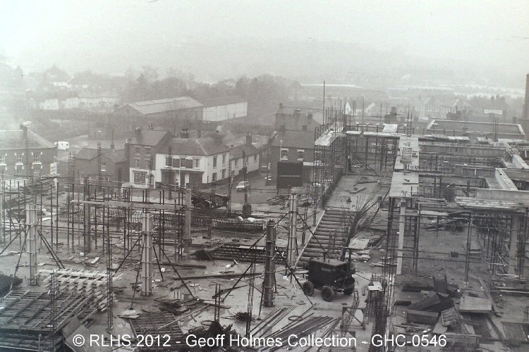 A view across from the Kingfisher Tower(?) under construction with the Golden Cross pub and the footbridge across the Railway yard.